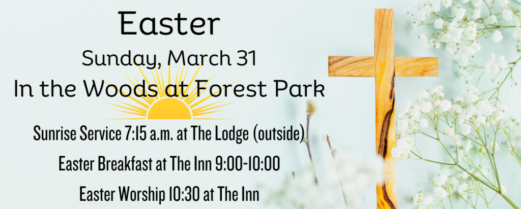 Join us for Resurrection Day! We begin early at dawn with a Sunrise Service at 7:15. We will be outside, so dress warm. It is a lovely service watching the sun come up in the east over the river. We will be by The Lodge at Forest Park.